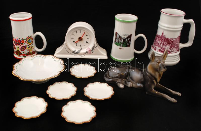 Vegyes porcelán tétel: 2 db Hollóházi és 1 db Alföldi porcelán korsó, matricás, hibátlan, jelzett, m: 14 és 17 cm; Virágmintás porcelán óra, matricás, működő óraszerkezettel, 18x12x4,5 cm; Hollóházi porcelán kutya, kézzel festett, jelzett, hibátlan, 20x11 cm; Bavaria porcelán kínáló tál, kis tálkákkal(5+1 db), kézzel festett, jelzett, hibátlan, d: 14,5 cm, d: 8 cm