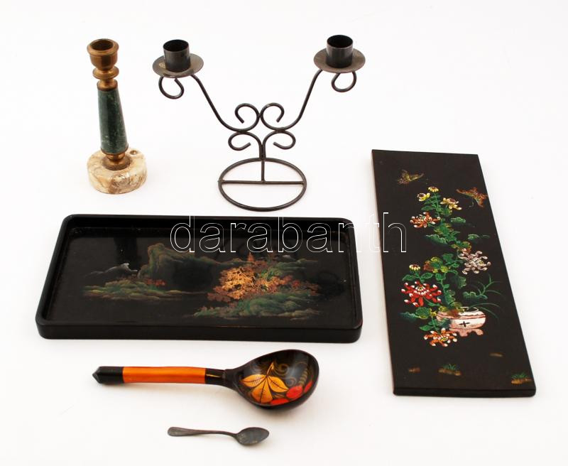 2 db távol-keleti fa tábla és tálca, 2 db fém gyertyatartó, fa kanál