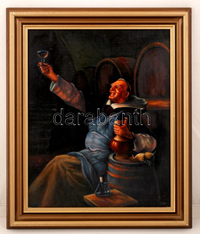 Lányi János (?-): Borkóstoló szerzetes. Olaj, farost, jelzett, keretb...
