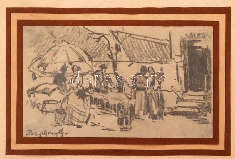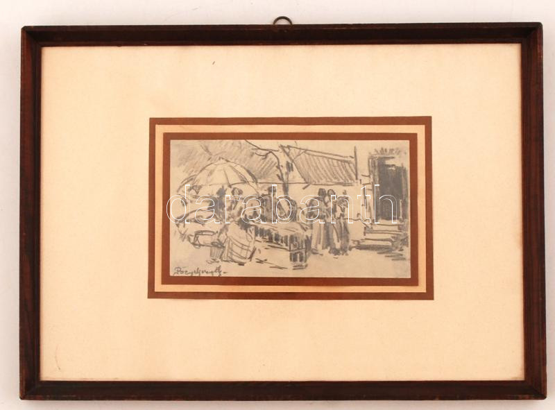 Pörge Gergely (1858-1930): Vásár, grafika, papír, jelzett, üvegezett ...