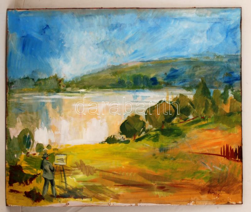 Szőnyi jelzéssel: Festő a folyóparton. Olaj, farost, 60×72 cm