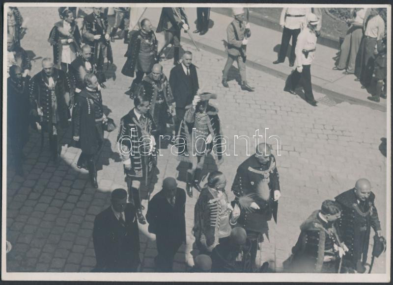 cca 1935 Foto Kaula: Díszmagyarba öltözött urak felvonulása a várban, ...