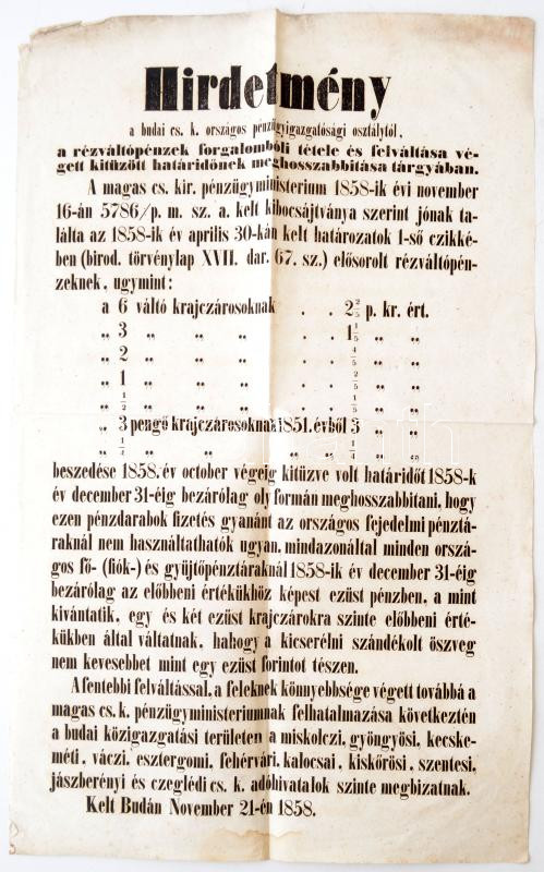 1858 Hirdetmény a rézváltópénzek forgalombóli tétele és felváltása végett kitűzött határidőnek meghosszabbítása tárgyában.30x50 cm