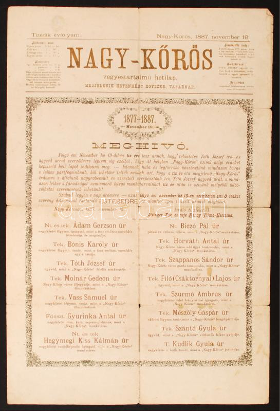1887 Nagykőrös, A Nagy-Kőrös vegyes tartalmú hetilap tízéves évfordulója alkalmából kiadott meghívó estebédre, szakadásokkal, 48x31 cm