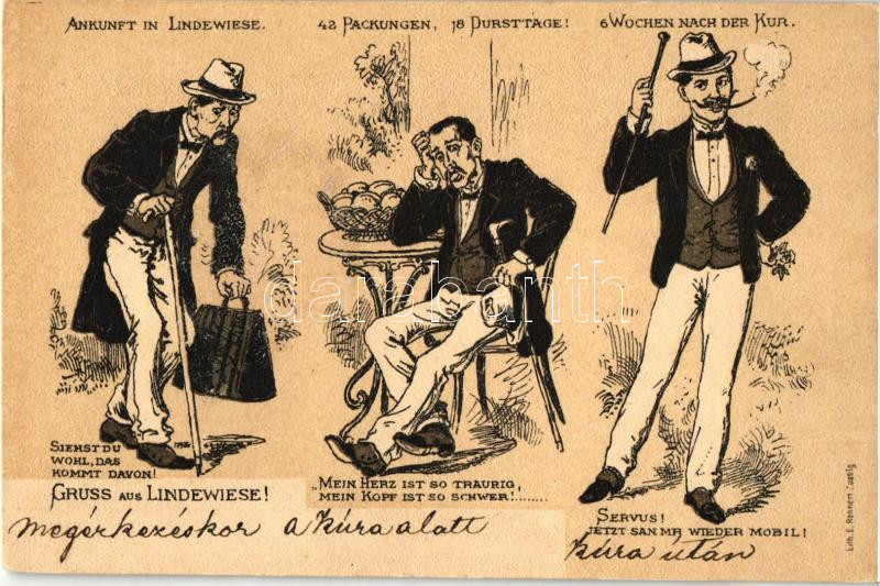 Lipová-lázne, Lindewiese; humorous advertisment postcard, before and a...