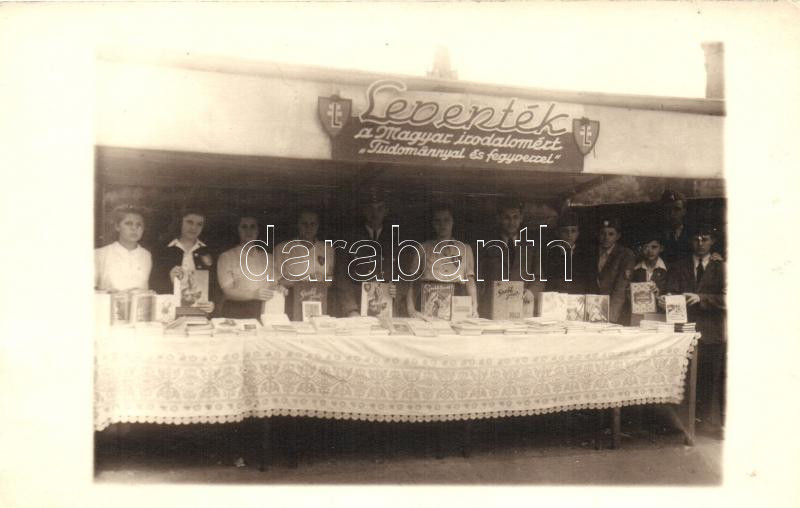 Description: Leventék a magyar irodalomért "Tudománnyal és fegyverrel" irredenta kiadványok vására / WWII-era Hungarian paramilitary youth organization at a book publishing fair, photo