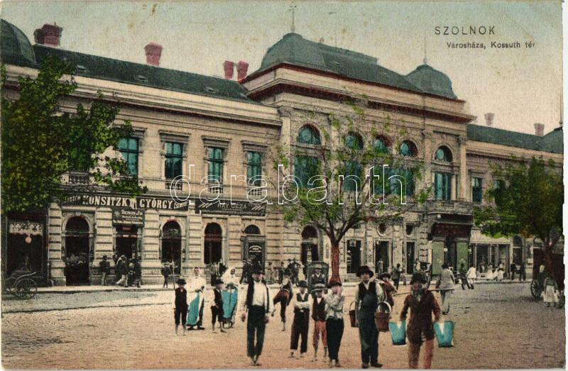 https://www.darabanth.com/en/266-Online-auction/266.0/Postcards/Hungary~300057/Szolnok-Varoshaza-Kossuth-ter-Konsitzky-Gyorgy-es-Hay-Geza-uzlete-azott-sarok-wet-cor~II1333619