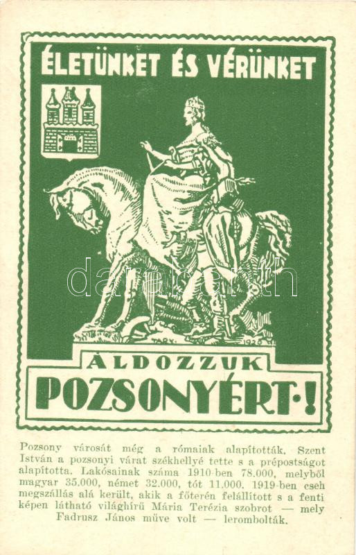 Pozsony, Bratislava; 'Életünket és vérünket áldozzuk Pozsonyért!&... https://www.darabanth.com/en/266-Online-auction/266.0/Postcards/Slovakia~300059/Pozsony-Bratislava-Eletunket-es-verunket-aldozzuk-Pozsonyert-irredenta-kepeslap-a-lero~II1334454