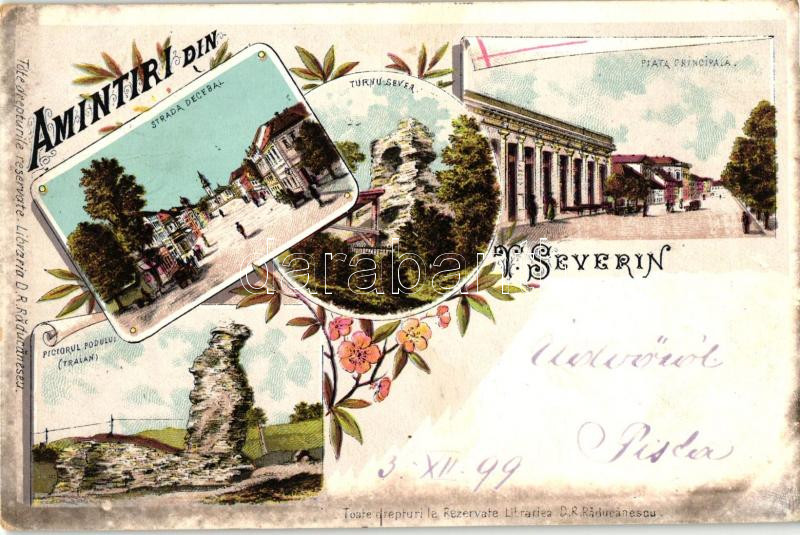 1899 Szörényvár, Turnu Severin; Strada Decebal, Piata Principala, Piciorul Podului, Tralan / út, tér, Szörényvártorony / street, square, castle tower, floral, litho (Rb)