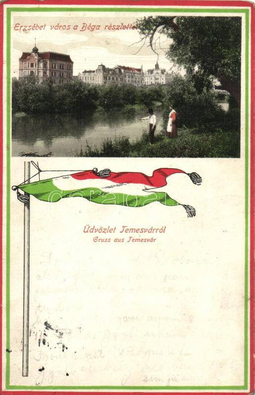 Description: Temesvár, Timisoara; Erzsébet város a Béga részlettel, magyar zászló, tábori bélyegzés a hátoldalon / Elisabeth district with river detail, Hungarian flag, field post cancellation on backside (kopott sarkak / worn edges)