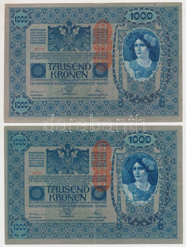 1902. 1000K (2x) mindkét oldal német, "Deutschösterreich" felülnyomáss...