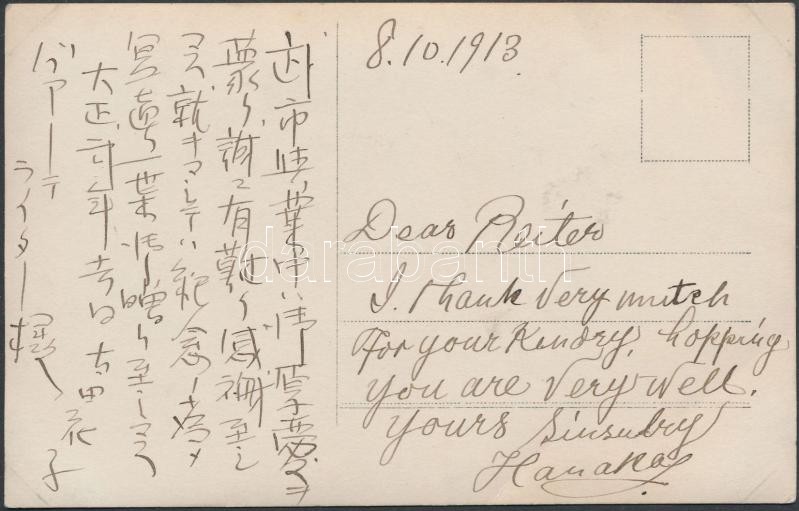 1913 Hanako japán színésznő aláírása és üdvözlő sorai az őt ábrázoló f...