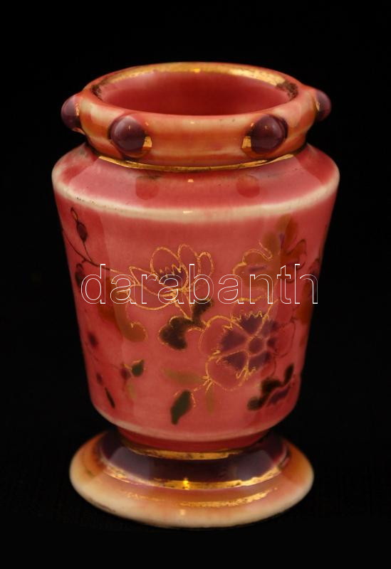 Antik virágmintás mini váza, kézzel festett, jelzés nélkül, kopott aranyozással, m: 6,5 cm
