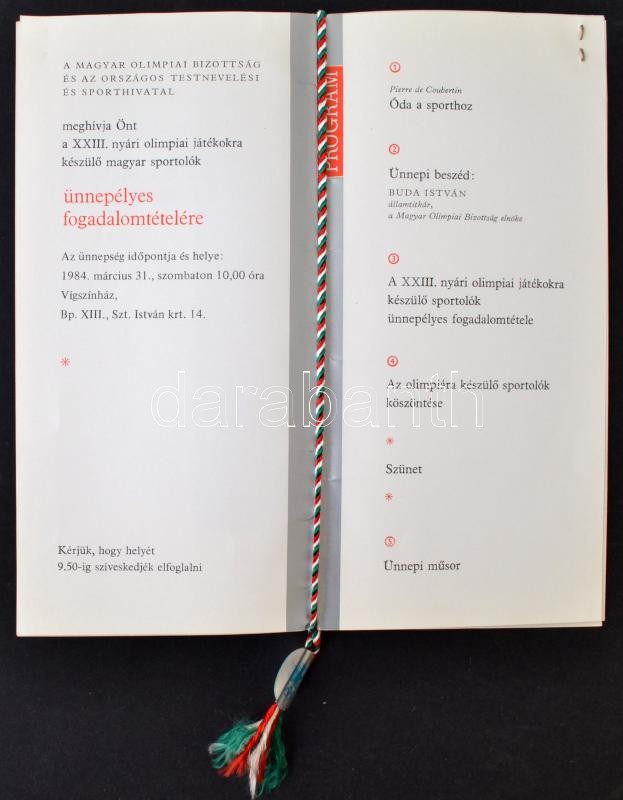1984 Meghívó az olimpiai fogadalomtételre, hozzá tartozó jeggyel