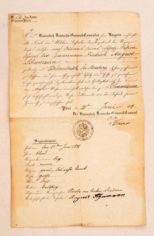 1879 Pest, Ideiglenes útlevél kiállításához szükséges okmány német nyelven személyleírással