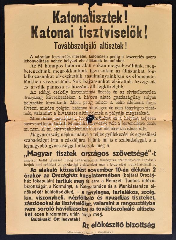 1918 Felhívás a magyar tisztek országos szövetségének megalakítására, nagyméretű plakát szakadásokkal, 62x48 cm