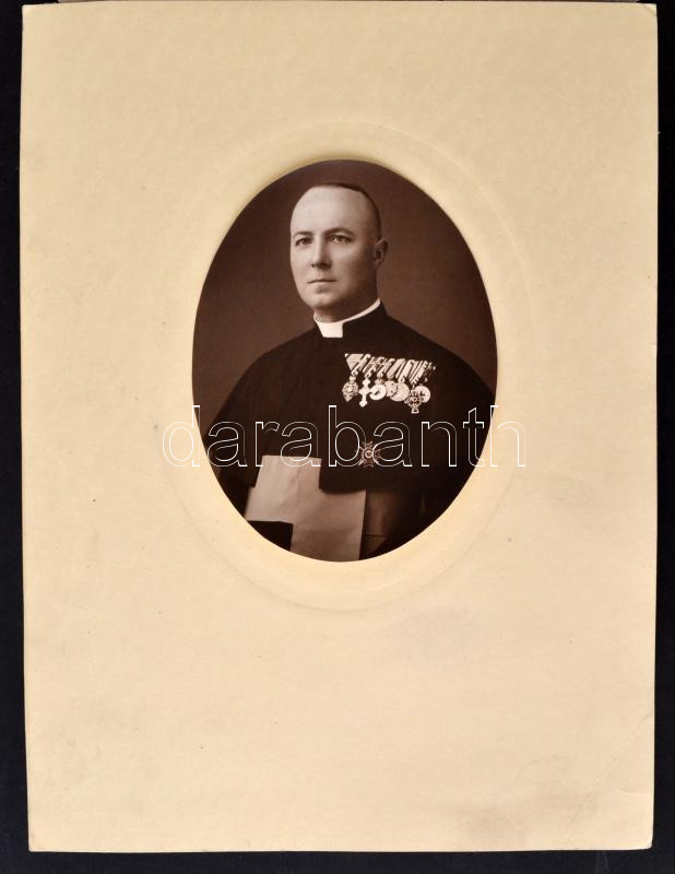 cca 1914-1918 Toma Imre (1884-1946) plébános, tábori lelkész, későbbi esperesről készült fotó, kitüntetésekkel, kartonra kasírozva, 15x12 cm