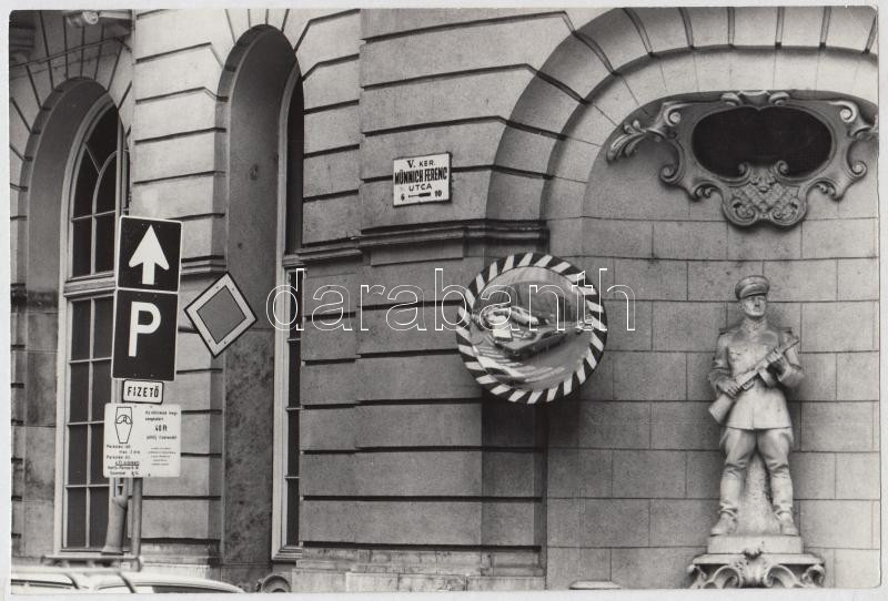 1990 Kaiser Ottó: Münnich Ferenc utca és emlékmű, pecséttel jelzett vintage fotóművészeti alkotás, 16x23 cm