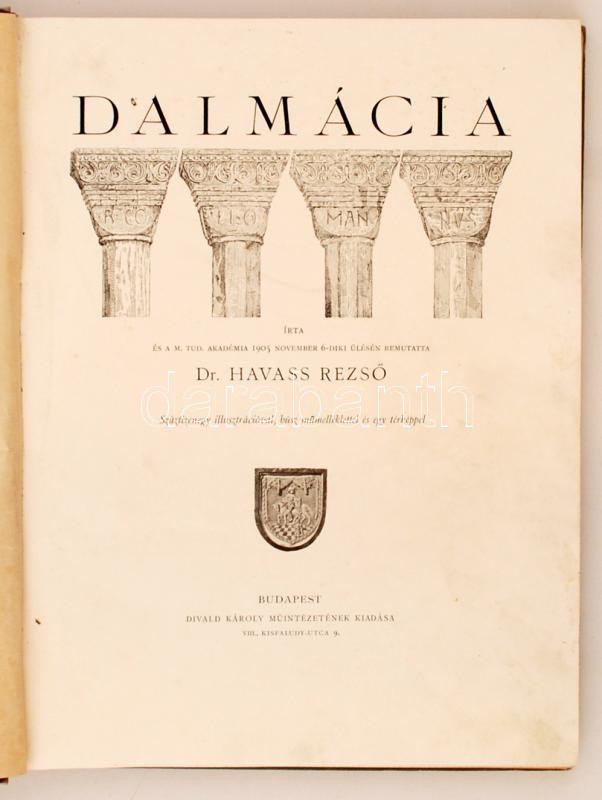 Havass Rezső Dalmácia. Száztizenegy illusztrációval, húsz műmelléklettel és egy térképpel Bp. (1905.) Divald. Divald Károly fénynyomatai védő hártyapapírral. Kiadói, aranyozott, festett, címerrel illusztrált egészvászon kötéses díszalbum, Gottermayer műhelyéből. Kissé kopottas a gerincnél