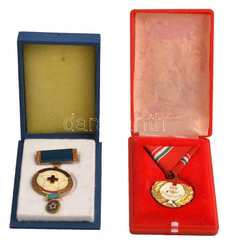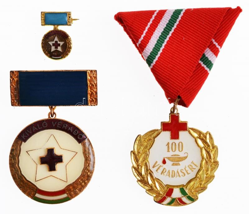 ~1970-1980. "100 véradásért" zománcozott fém kitüntetés miniatűrrel, dísztokban + "Kiváló véradó" zománcozott fém kitüntetés, dísztokban T:2