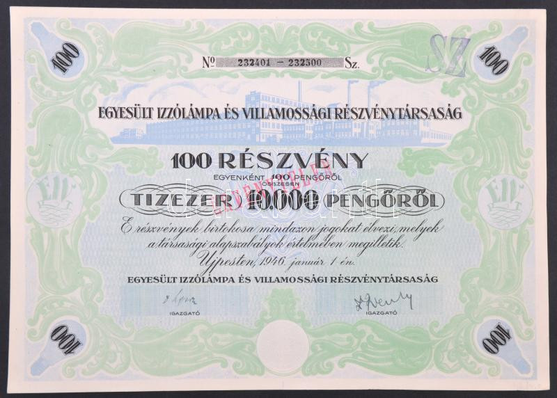 Újpest 1946. "Egyesült Izzólámpa és Villamossági Részvénytársaság" részvénye 10.000P-ről, felülbélyegzett, szárazpecséttel és szelvényekkel T:I-