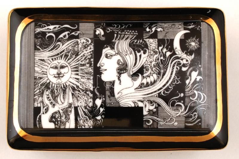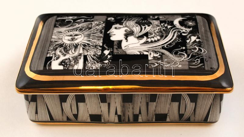 Description: Szász Endre által tervezett aranyozott jelzett Hollóházi porcelán bonbonniere az "Arcok" sorozatból,