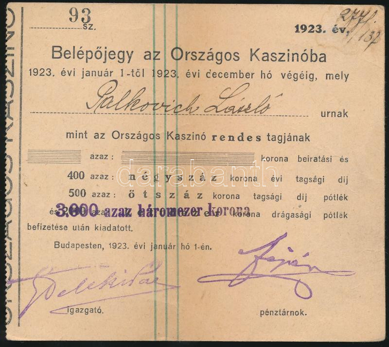 1923 belépőjegy az Országos Kaszinóba, Palkovich László (1877-1933) Ko...