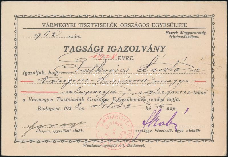 1928 a Vármegyei Tisztviselők Országos Egyesülete tagsági igazolványa ... https://www.darabanth.com/en/268-Online-auction/268.0/Other-collectibles/Documents~30/1928-a-Varmegyei-Tisztviselok-Orszagos-Egyesulete-tagsagi-igazolvanya-Palkovich-Laszlo-1877~II1350837