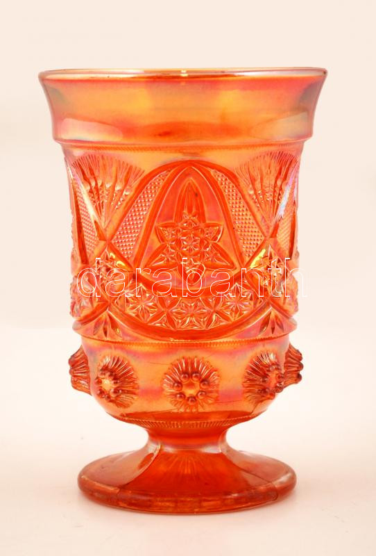 Díszes irizáló talpas váza, formába öntött, hibátlan, m: 16,5 cm
