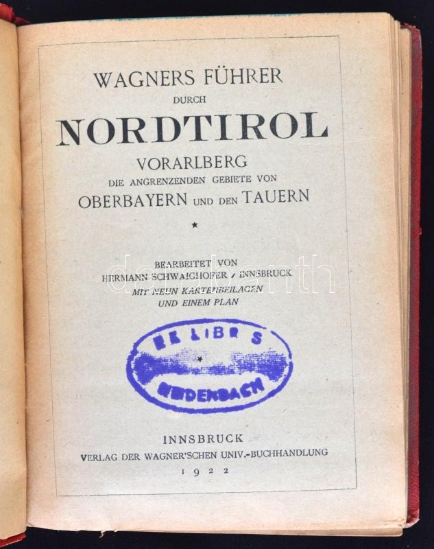 Wagners Führer durch Nordtirol, Vorarlberg, die angrenzenden Gebiete von Oberbayern und den Tauern. Innsbruck, 1922, Verlag von Wagner'schen Universitätsbuchhandlung. Számos térképmelléklettel. Kicsit kopott félvászon kötésben, egyébként jó állapotban.