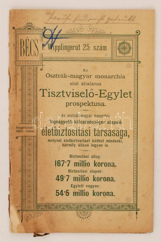 1902 Az Osztrák-magyar monarchia első általános Tisztviselő -Egylet prospektusa. Okmánybélyeggel (30fillér), pp.:26,