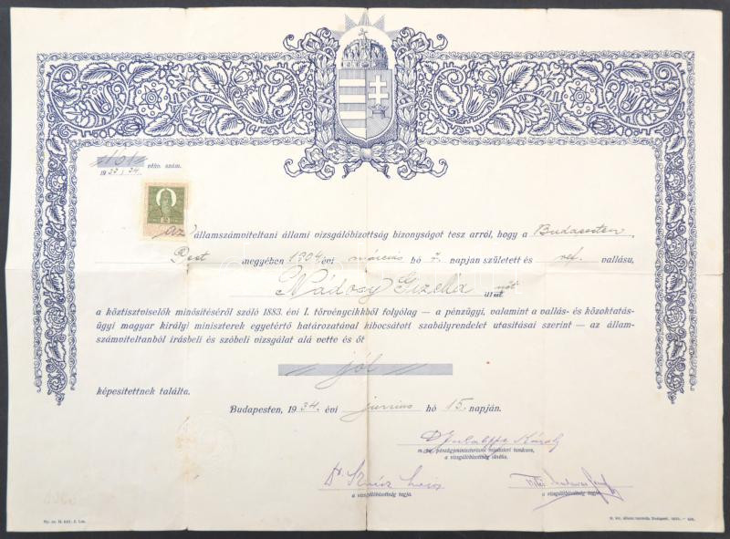1934 Államszámviteltani vizsgabizonyítvány köztisztviselő részére, okm...
