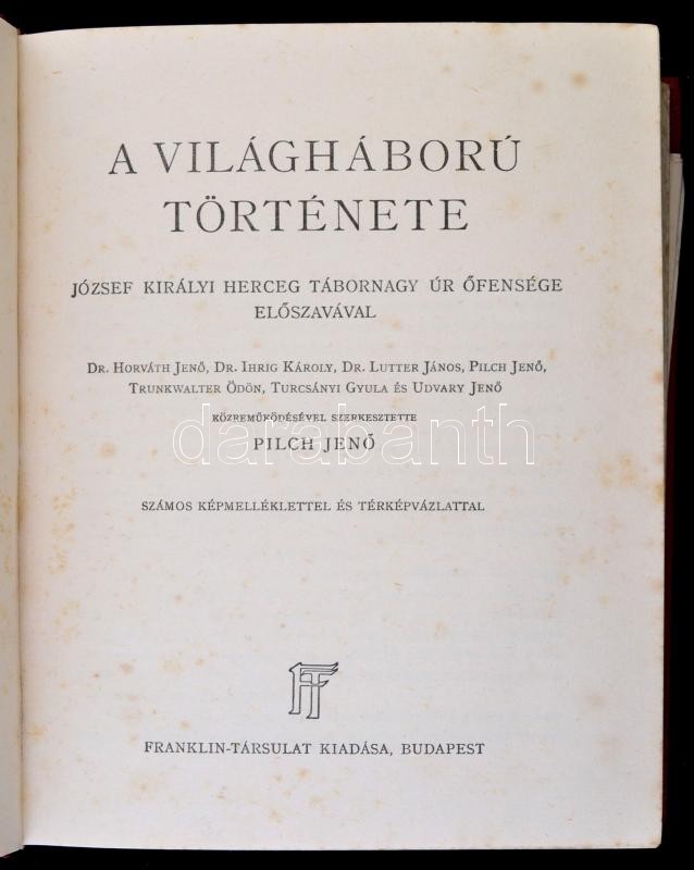 Pilch Jenő (szerk.): A világháború története. József királyi herceg tábornagy úr őfensége előszavával. Bp., é.n. [1928], Franklin, 418 p.+55 t.+5 mell. Kiadói díszes, dúsan aranyozott egészvászon-kötésben, számos fekete-fehér képmellékletekkel, és térképvázlatokkal, mellékletekkel, kissé foltos lapélekkel. Szép állapotban.