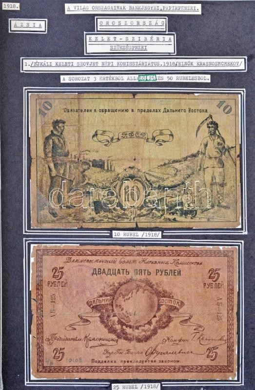 Egyedülálló orosz és szovjet bankjegy/szükségpénz/kötvény gyűjtemény öt albumba rendezve, leírásokkal kísérve (~900db). A cári Oroszország bankjegyei egy, a polgárháború éveiben kiadottak három, végül a Szovjetunió és Oroszország bankjegyei egy albumba rendezve. Mindegyik időszak részletesen katalogizálva, több teljes sorozattal. A legérdekesebb a három polgárháborús album, melyek Észak-Oroszországtól kezdve Szibériáig minden területről tartalmaznak pénzeket, több igen ritka és érdekes darabbal. Megtekintésre ajánlott! T:vegyes, több restaurált és erősen sérült bankjegy is / Unique collection of Russian and Soviet banknotes/necessity notes/bonds in five albums (~900pcs) with informative texts (in Hungarian language). Banknotes of the Russian Empire are in one album, currency from the Civil War in three, and the money of the Soviet Union and Russia again in one album. All time periods are cataloged in detail with several complete series. Probably the most interesting notes are from the Civil War, which contain banknotes from North-Russia all the way to Siberia, with several rare and interesting pieces. Well worth seeing! C:mixed, several restored and damaged banknotes