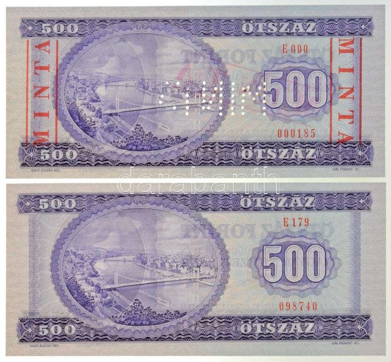 Description: 1990. 500Ft "E000 000185" sorozat és sorszámmal, piros "MINTA" felülnyomással és perforációval + 1990. 500Ft T:I / Hungary 1990. 500 Forint with "E000 000560" serial number and with red "MINTA(SPECIMEN)" overprint and perforation + 1990. 500 Forint C:UNC Adamo F43Ma,F43