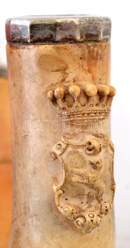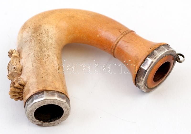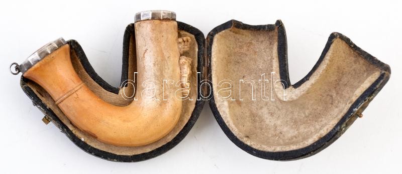 Tajtékpipa, ezüst (Ag.) szerelékkel, homlokán családi címerrel, jelzett, bőr tokban, 8×6 cm / Meerschaum pipe with silver (Ag.) inlay, with family coat-of-arms on it, with hallmark, in leather case, 8×6 cm