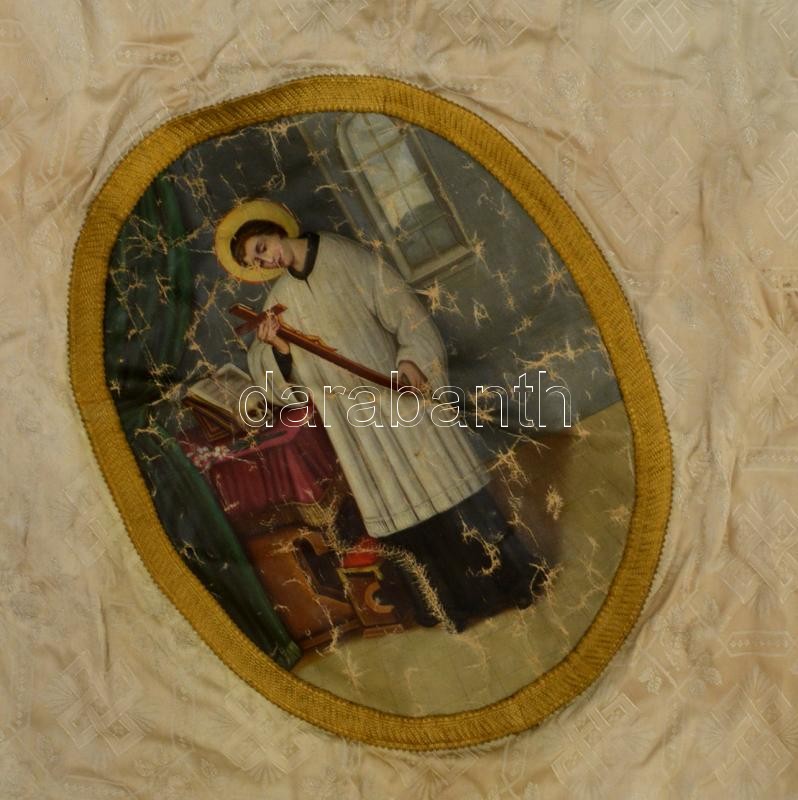 Description: cca 1930 Körmeneti selyem zászló, Szent Imre és Gonzaga Szent Alajos kézzel festett olaj képével, festékhiánnyal, tetején szakadással,140x100 cm /