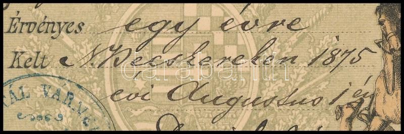 1875 Nagybecskerek 1. számú vadászati jegy 12Ft, vadászjegy / 12Ft Litho hunter's licence Nr. 1.