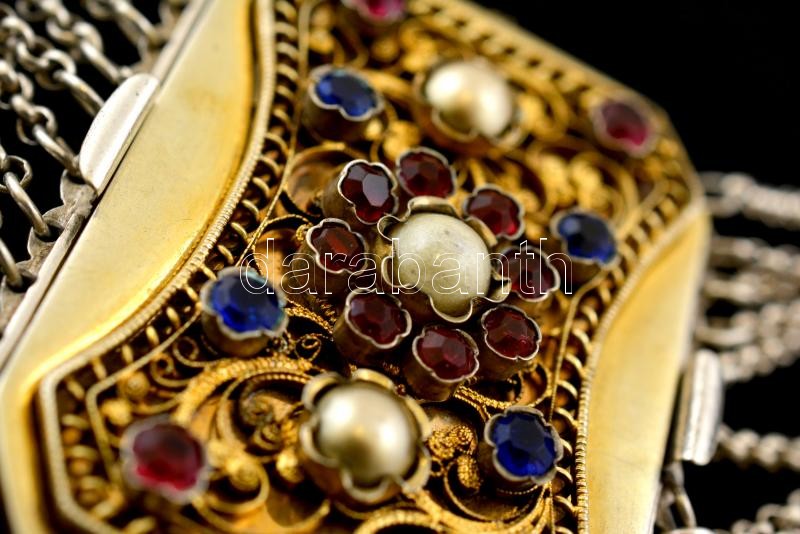 cca 1850 ezüst (Ag.) biedermeier nyakdísz aranyozott filigrán közép résszel, csiszolt kővekkel, jelzett (13 lat), mestejeggyel (Storr), középrész: 5,5×4 cm, h:33 cm, bruttó: 98 g / Biedermeier silver necklace, with gems, with hallmark
