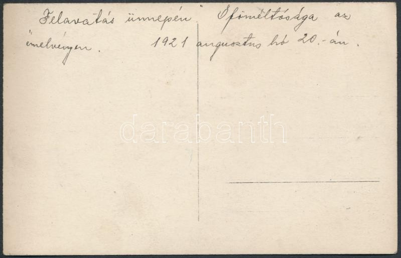 Description: 1921 Horthy Miklós magasrangú tisztek között, a Ludovika Akadémia tisztavató ünnepségén, 1921. augusztus 20. a hátoldalon feliratozva, fotólap, 9x14 cm.