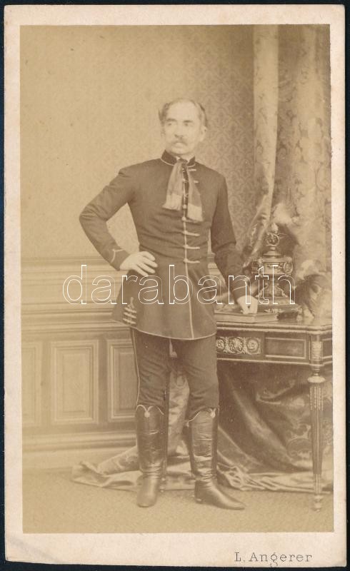 Description: cca 1860 Gróf szlavnicai és bajnai Sándor Móric (1805-1878) az "Ördöglovas", főúr, európai hírű lovas, úszó és vadász, keményhátú fotó, L. Angerer műterméből, 10x6 cm