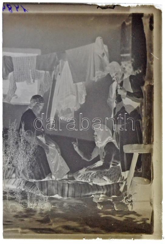 cca 1930 Kártyavető jósnő egy falusi ház tornácán, üveglemez negatív K...