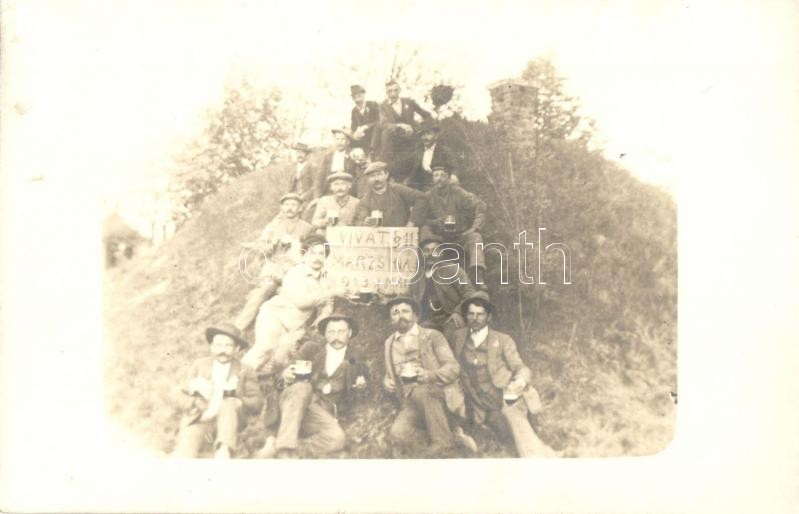 Description: 1913 Vivat § 11 Marzsina! Május elsejei söröző társaság a sörivás 11. paragráfusával: Igyál annyit, amennyit bírsz! / Beer drinking group of men with the 11th paragraph of beer drinking: Drink as much as you can! photo