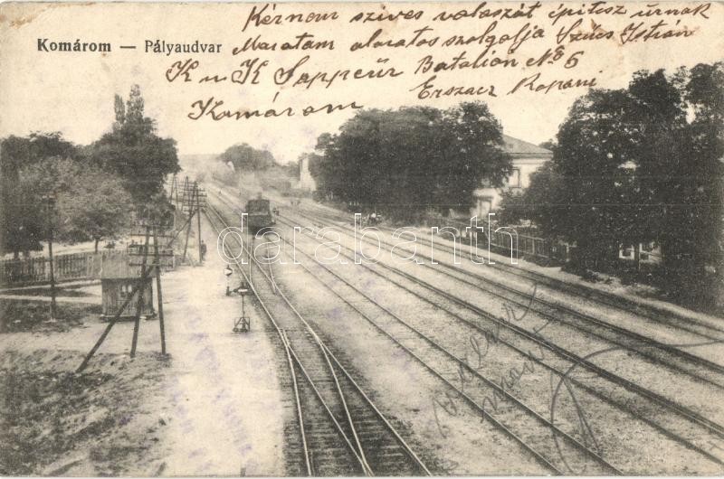 Komárom, Komárnó; vasútállomás, vágányok vonattal / Bahnhof / railway ...