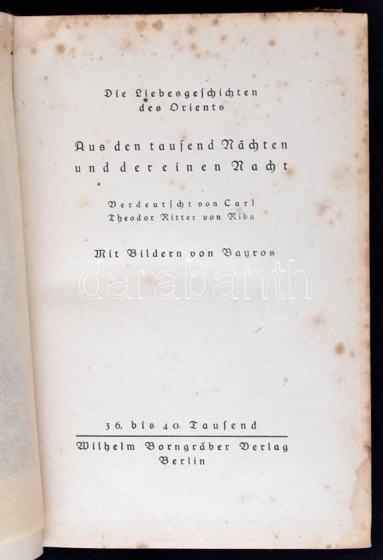 Description: Ezeregyéjszaka / 1001 Nacht - Aus den tausend Nachten und der einen Nacht. Die Berühmten Liebesgeschichten und Marchen des Orients. Berlin, É.N., Wilhelm Borngraber. Foltos kiadói félvászon kötésben, 518 p. Német nyelvű. Bayros erotikus illusztrációival. A borítója és a lapok eléggé foltosak.