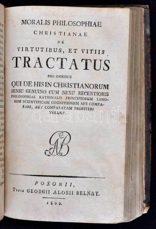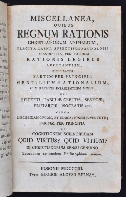 3 latin nyelvű munka egybekötve. 1. Mailáth György (1786-1861): Assertiones ex universa philosophia quas sub gratiosis auspiciis excellentissimi, illustrissimi, et reverendissimi domini Francisci Xaverii Fuchs. Pozsony, 1803, Georgii Aloysii Belnay. 2. Miscellanea, quibus regnum rationis christianorum animalium, placita carni, affectibusque dolosis blandientia, pro totidem rationis legibus adoptantium, ... Pozsony, 1803, Georgii Aloysii Belnay. 3. Moralis philosophiae christianae de virtutibus, et vitiis tractatus...Pozsony, 1802, Georgii Aloysii Belnay. Korabeli aranyozott gerincű bőrkötés, a gerincén aranyozott Miscellanea felirattal, 16+XXXII+2+272+VIII+224 p. Latin nyelvű. A borítója kopottas, foltos. A lapok foltosak. Az utolsó lapok némileg hiányosak.
