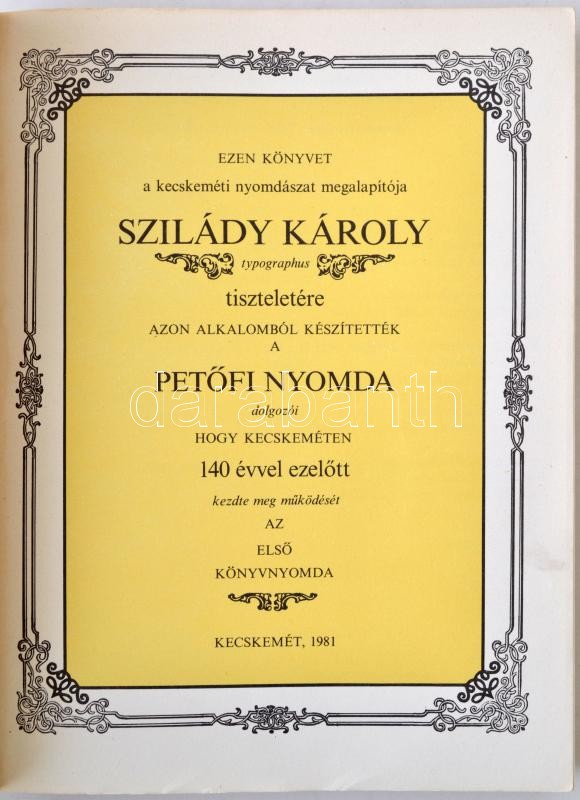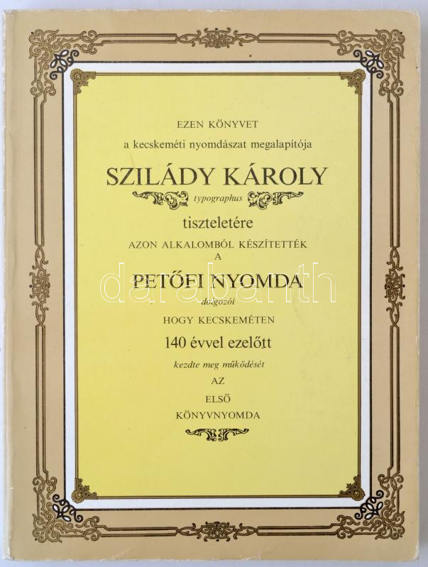 Description: Tóth Sándor-Bagi Béla (szerk.): Szilády Károly emlékkönyv. Ezen könyvet a kecskeméti nyomdászat megalapítója Szilády Károly typographus tiszteletére azon alkalomból készítették a Petőfi Nyomda dolgozói, hogy Kecskeméten 140 évvel ezelőtt kezdte meg működését az első könyvnyomda. Petőfi Nyomda Kiadványai II. Kecskemét, 1981, Petőfi Nyomda. Kiadói ragasztott papírborító, 245 p. Jó állapotban.