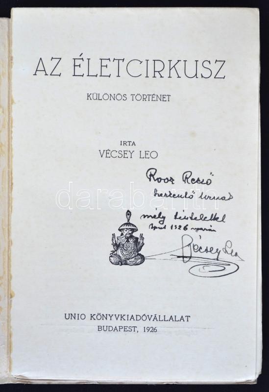 Vécsey Leó: Az életcirkusz. Különös történet. Bp., 1926, Unio Könyvkiadó. 160 p. Kiadói papírkötésben. Dedikált példány!