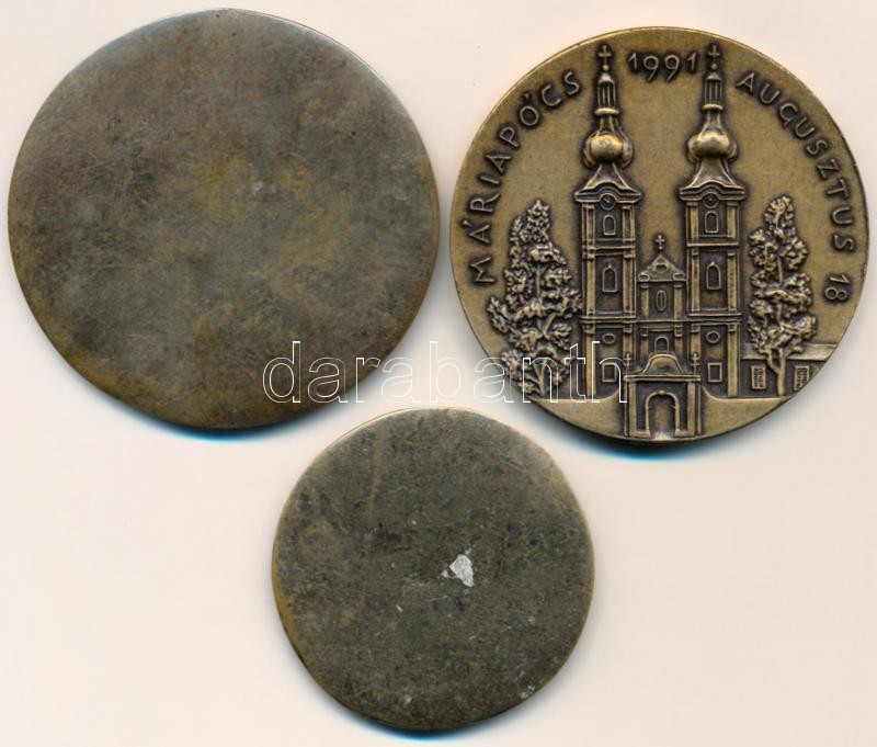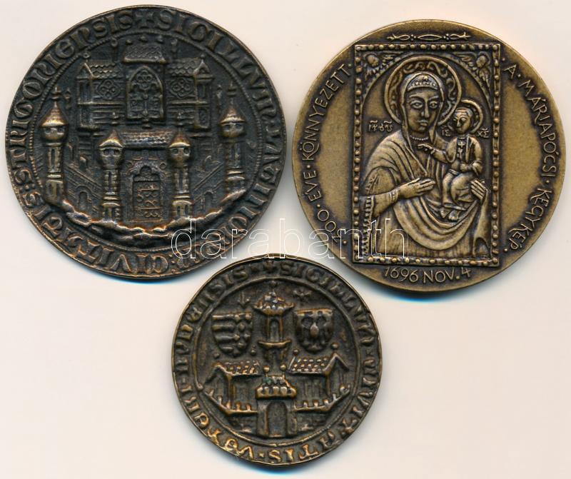 Description: Tóth Sándor (1933-) 1991. "Máriapócs 1991 Augusztus 18. / 300 éve könnyezett a máriapócsi kegykép - 1696. November 4." Br emlékérem (65mm) + 2db replika(!) Buda és Esztergom középkori pecsétjének Br másolatai / with replica pcs T:2
