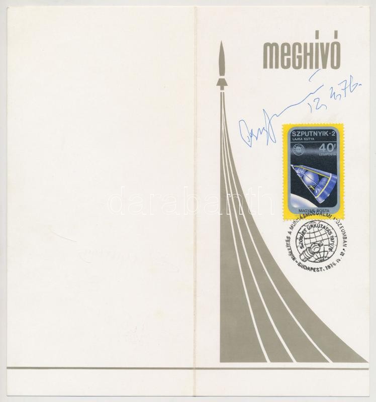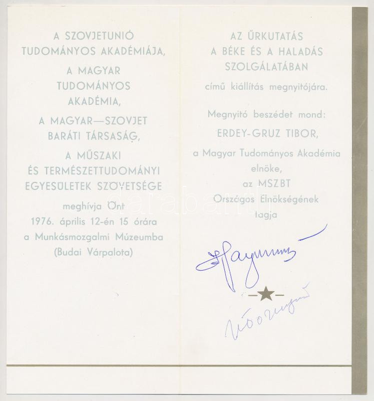 1976 Azonosítatlan űrhajósok (Leonov?) aláírásai az "Űrkutatás a béke és a haladás szolgálatában" c. kiállítás megnyitójának meghívóján